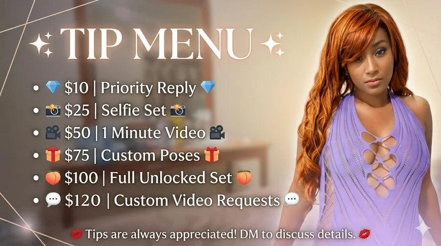 ทำอาหาร, คอร์เซ็ต, คุยเรื่องลามก, เต้นยั่ว, ใช้มือ, ส้นสูง, ช่วยตัวเอง, โรลเพลย์, เซ็กส์ทอย, อาบน้ำ, ตีก้น, ระบำเปลื้องผ้า, ใช้หน้าอก, ทเวิร์ก, โบลว์จ๊อบ, คาวเกิร์ล, ดีปโทรต, ดิลโด้หรือไวเบรเตอร์, ท่าหมา, เฟติชเท้า, นวด, นายหญิง, ถึงจุดสุดยอด, เปลือยอก, แอนัล, ของเล่นแอนัล, การให้คะแนนเจ้าโลก, คัมช็อต, สอดใส่สองทาง, แตกใส่หน้า, ทำให้สำลัก, ฮาร์ดคอร์, ทำให้อับอาย